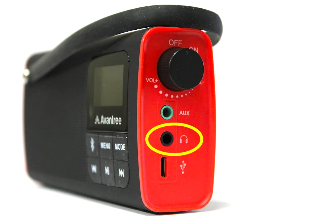 Auf Wunsch können Sie den SP850 über Kopfhörer/Ohrbücher hören. Schließen Sie einfach die Kopfhörer im mittleren Anschluss mit einem Kopfhörersymbol auf der Seite des SP850 unter dem Lautstärke/Stromschalter an.